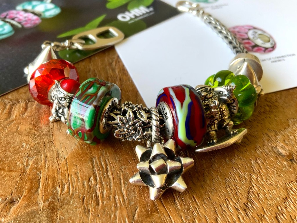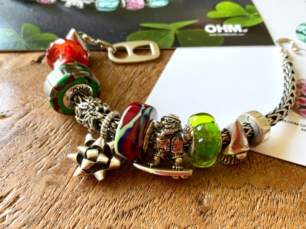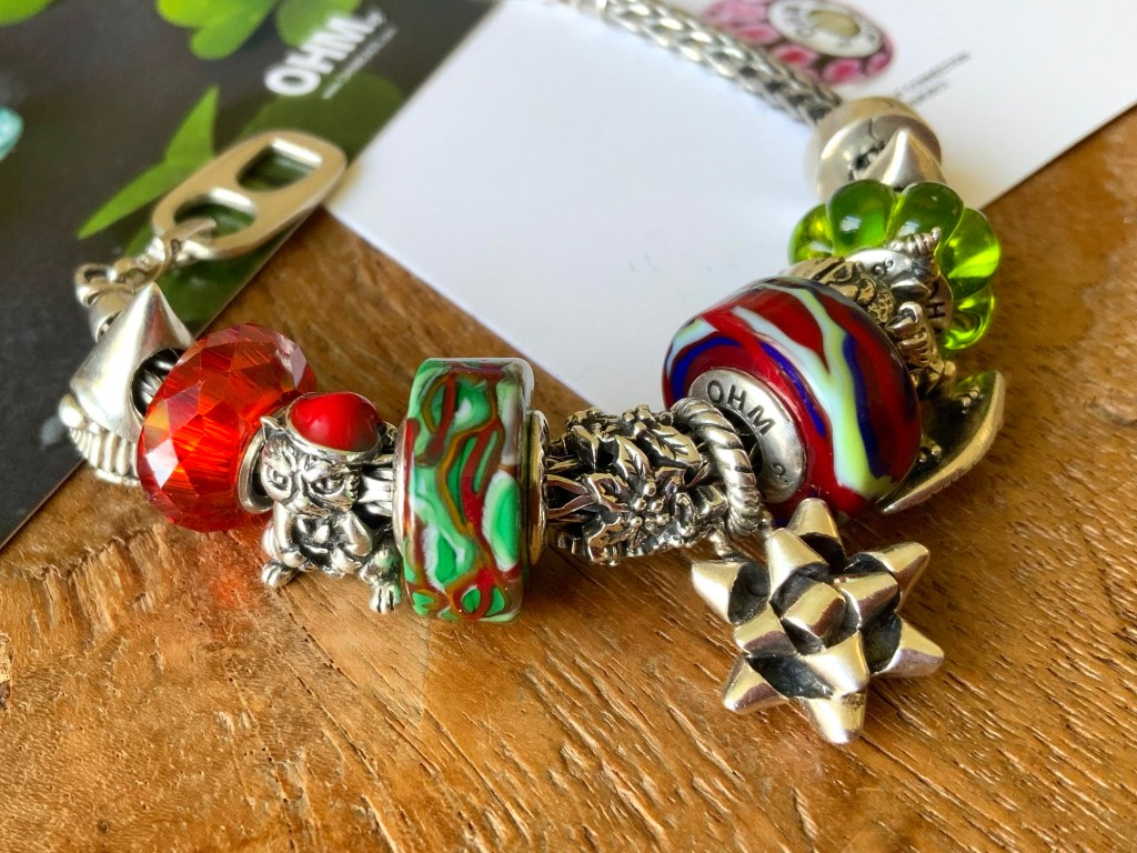 I never thought I would to do a Christmas bracelet at this time of year! But here it is! A Chunky bracelet with Can Tab clasp and Tomte Gnome, facet glass, HO! HO! No, Marley, Holly’s Frost, Beadmail no. 21 Wrapped Up, Mae Nak, Noice, GOTM no. 7 and Tomte Gnome.