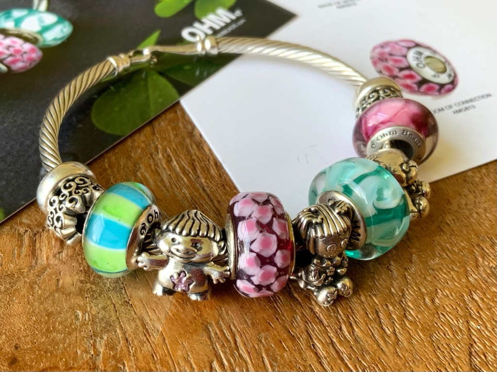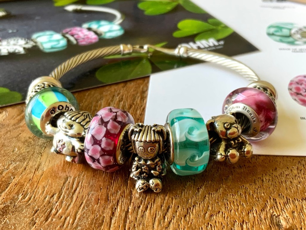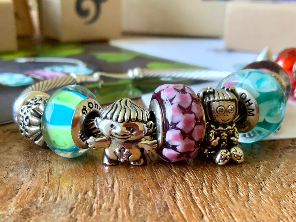 This bangle is all about the childhood toys and memories! With Beadmail no. 49 Sentimental Spirals Duo, Admirer, Treasured Trolls, Bloom Of Connection, Betty Buttons, Wave Of Mystery, Hug Me, Thunderstorms and Beadmail no. 49 Sentimental Spirals Duo.