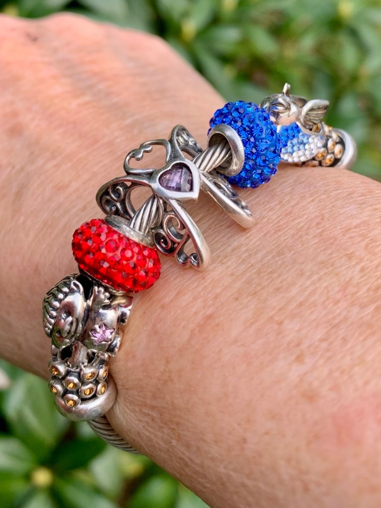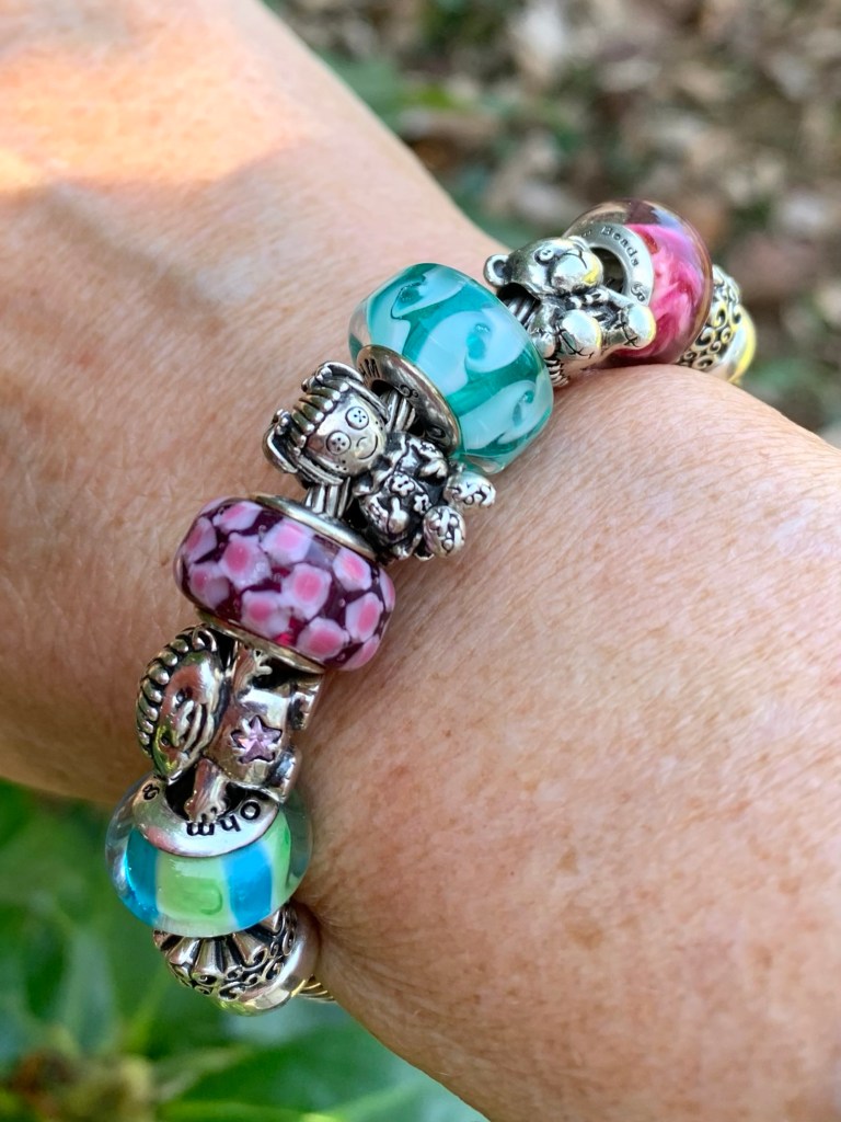I made a bangle with matching sparkling beads. With vintage spacers, Treasured Trolls, July, Celebrate Life, September, Bluebird Of Happiness and vintage spacers.